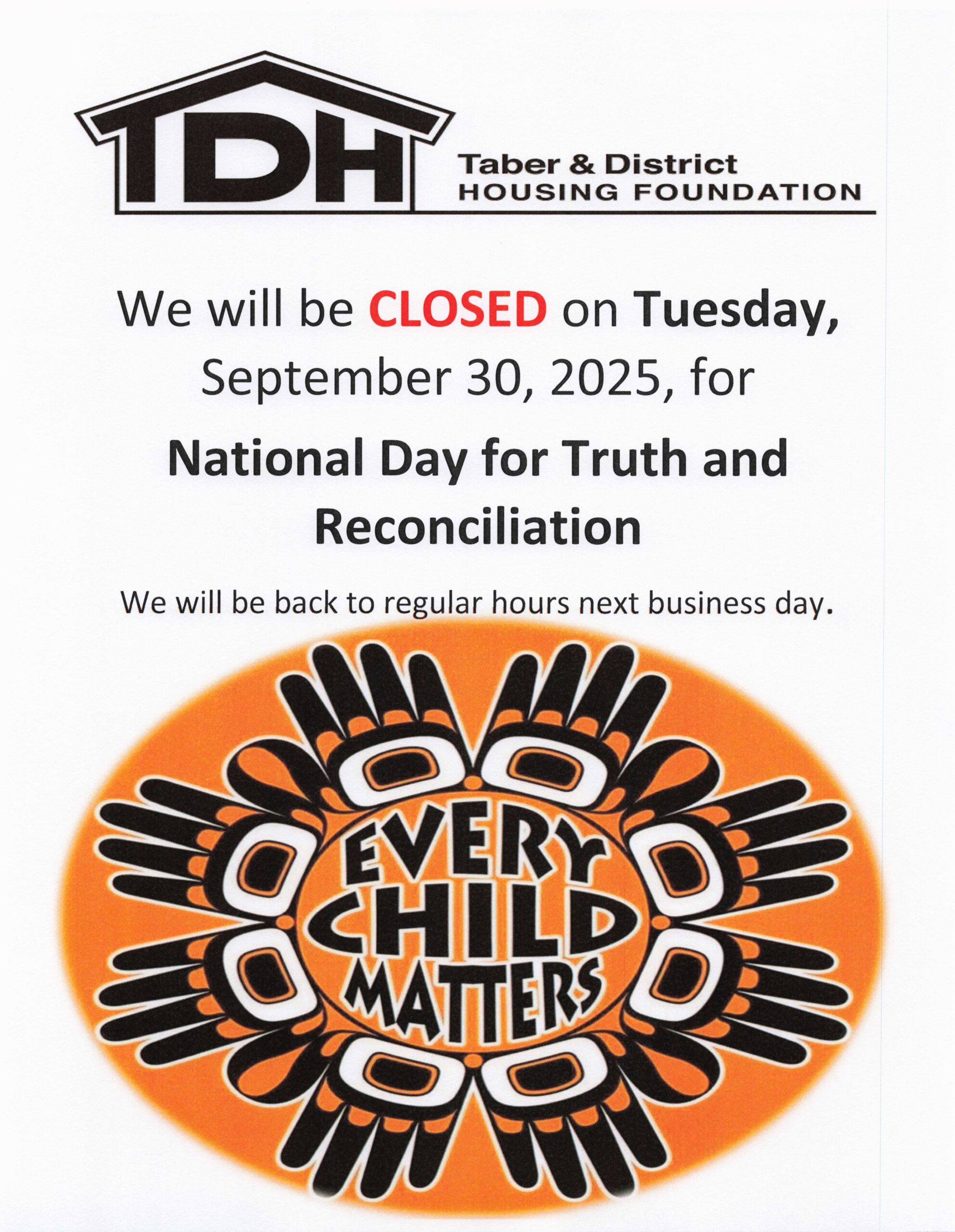 Admin Office at 5318 48 Ave, Taber will be CLOSED for National Day for Truth and Reconciliation