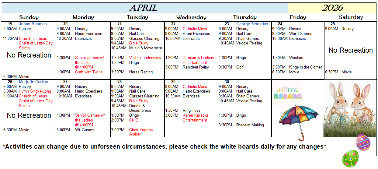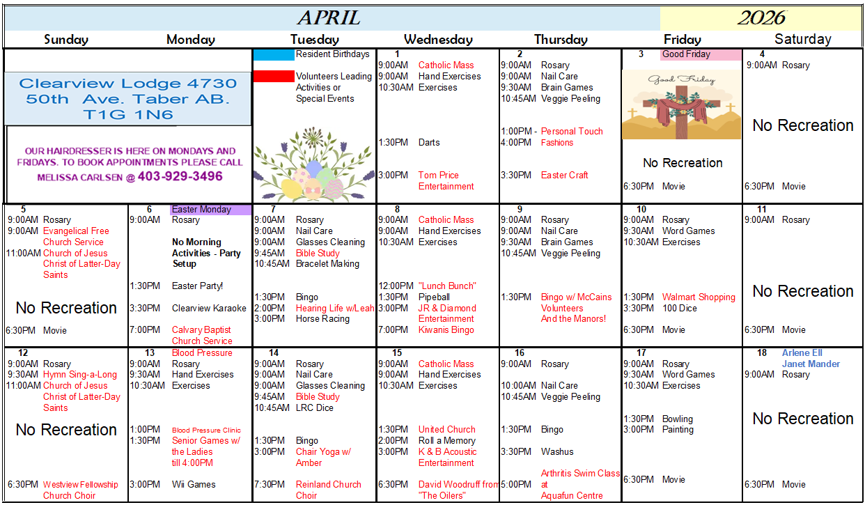 Clearview Lodge Activity Calendar – April 2026