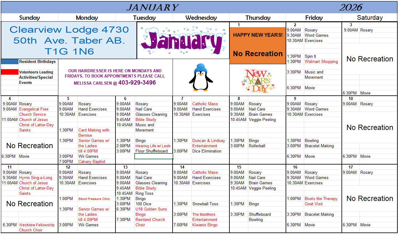 Clearview Lodge Menu – December 29, 2025 to January 4, 2026