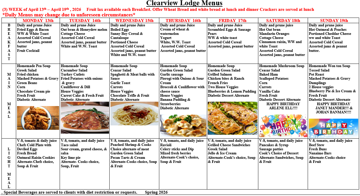 Clearview Lodge Menu – March 30 to April 5, 2026