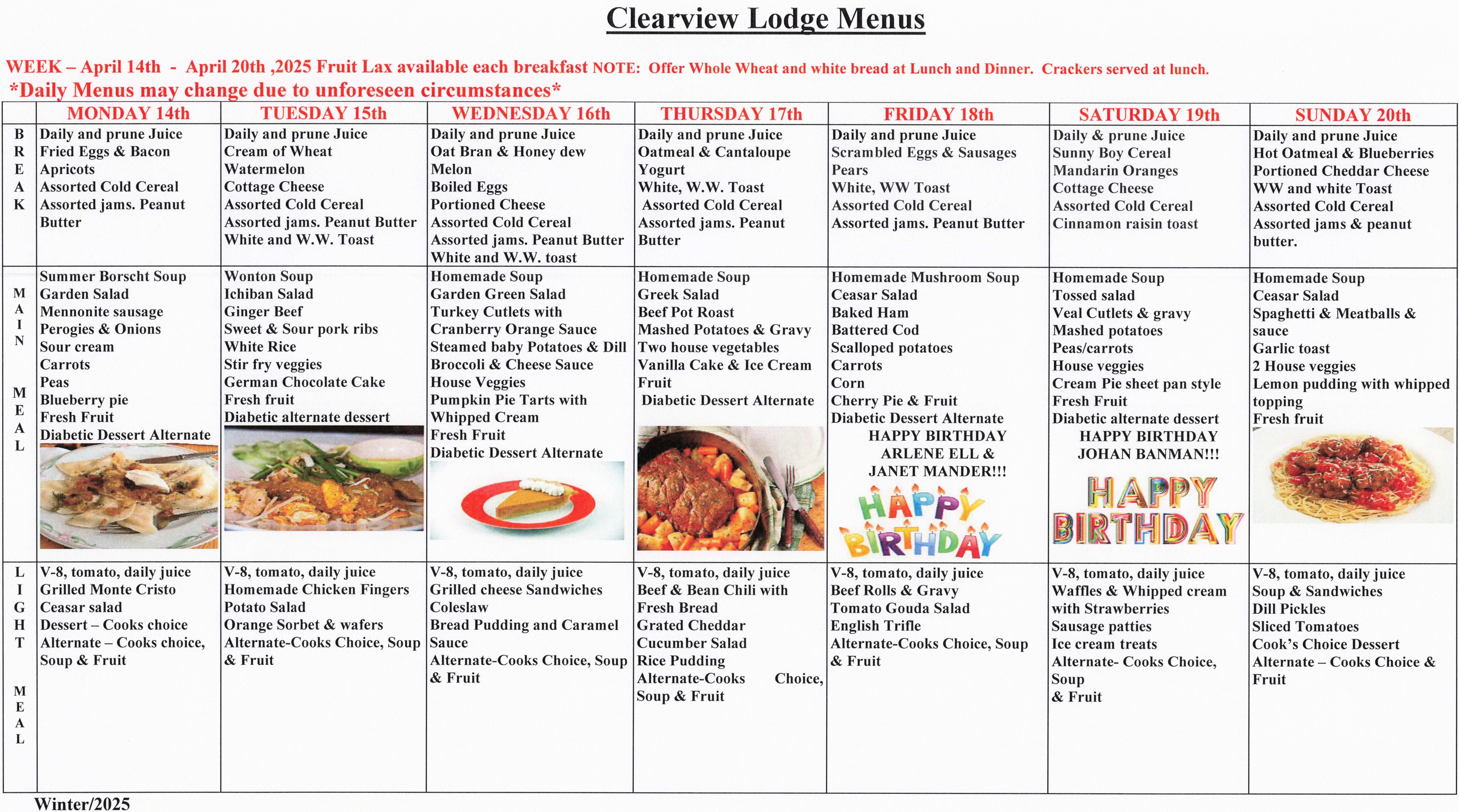 Clearview Lodge Menu – May 26 – June 1, 2025
