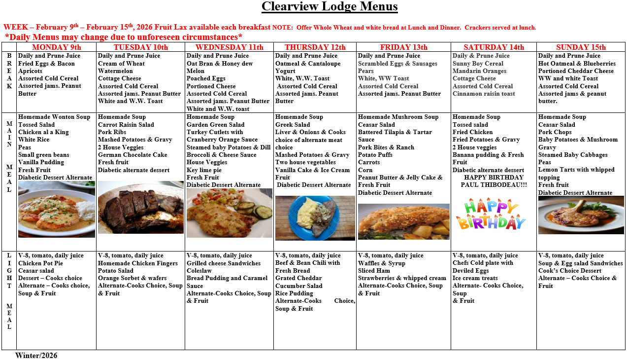 Clearview Lodge Menu – February 2-8, 2026