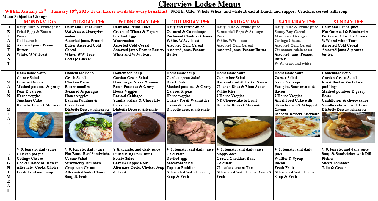 Clearview Lodge Menu – December 29, 2025 to January 4, 2026
