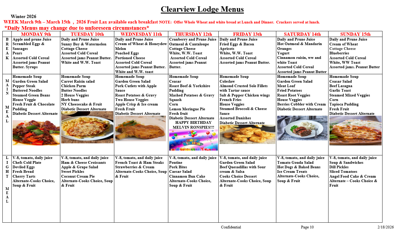 Clearview Lodge Menu- March 9-15, 2026