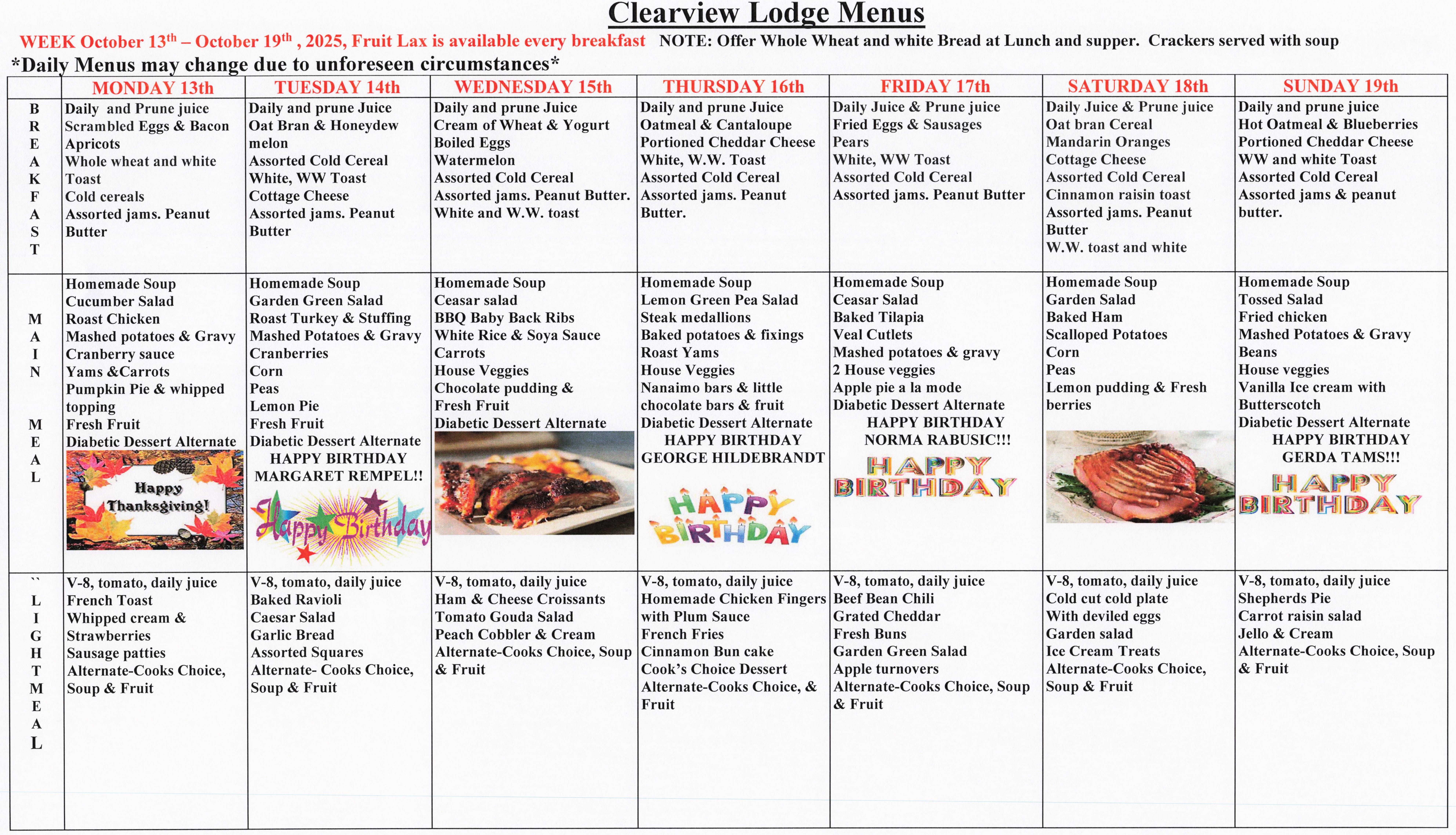Clearview Lodge Menu – October 13-19, 2025