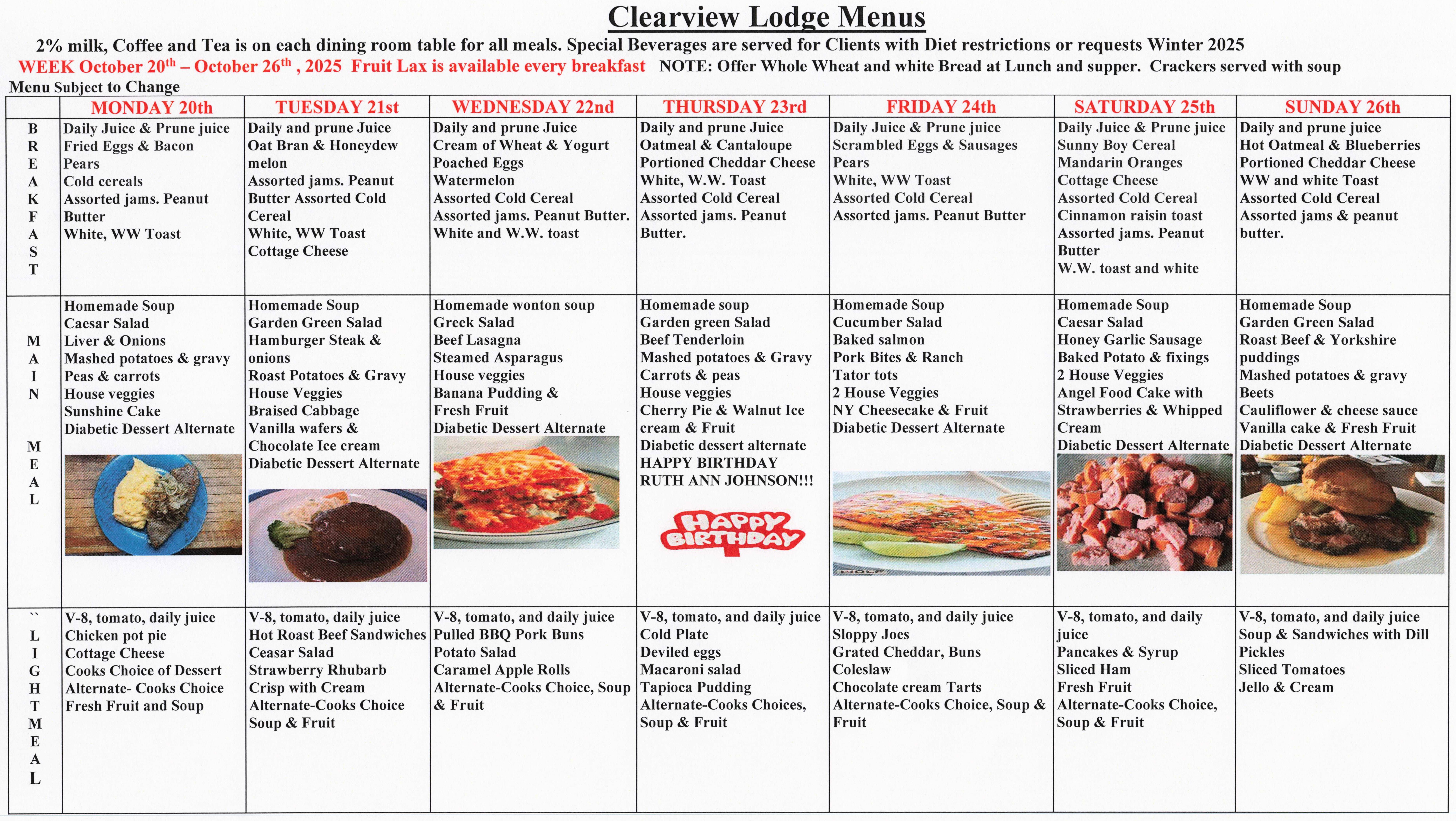 Clearview Lodge Menu – October 6-12, 2025